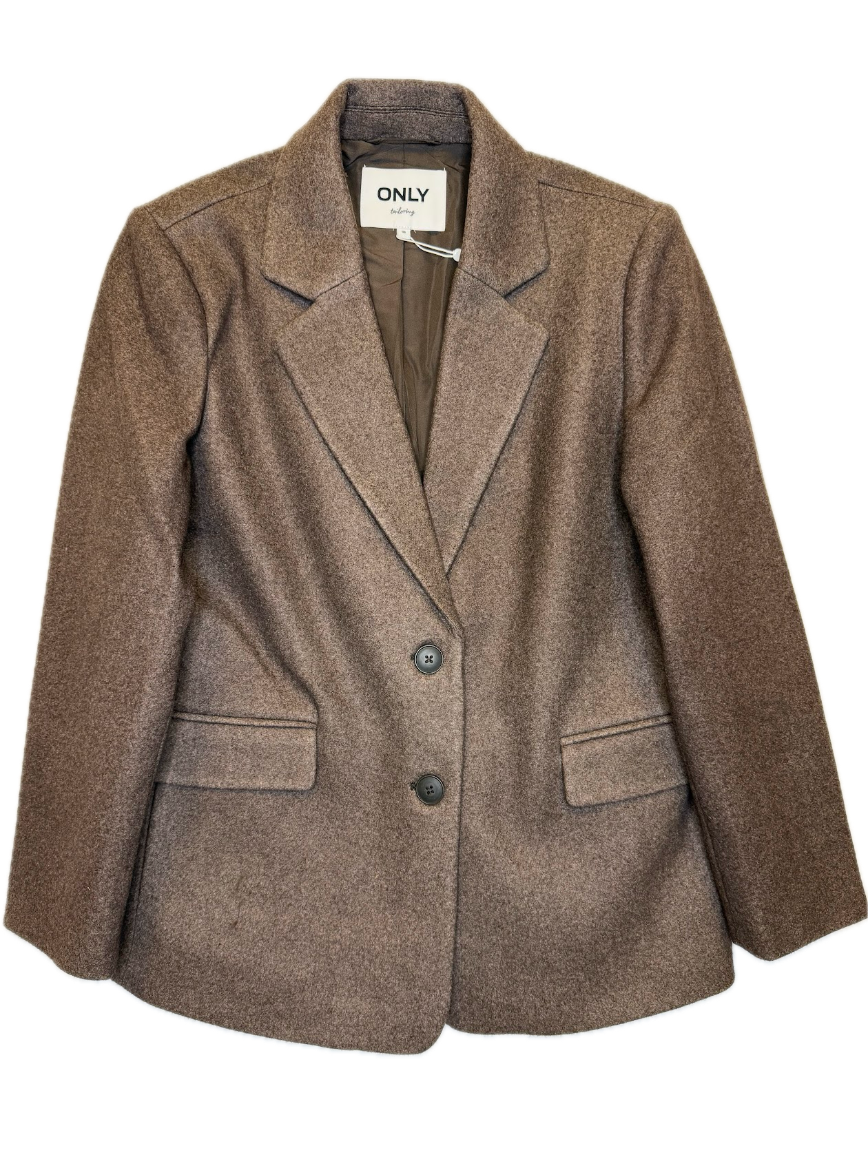 Structured brown blazer crafted from a textured wool-look fabric featuring a notched lapel and two-button closure.