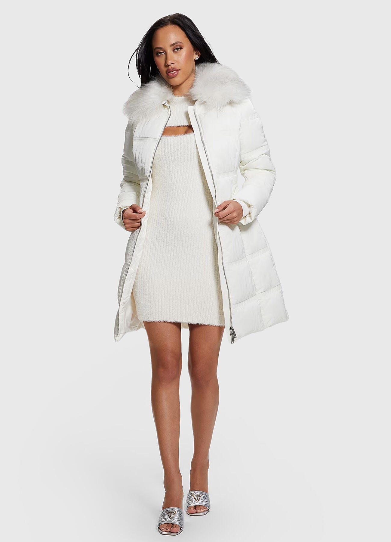 Balts, garš, pūkainais mētelis