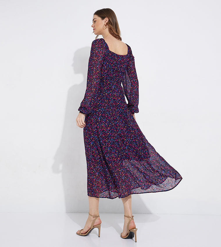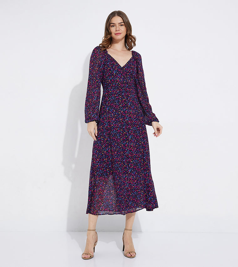 Viegla šifona sasienamā kleita ar ceriņkrāsas ziedu rakstu, sasienamu jostasvietu un V veida kakla izgriezumu.