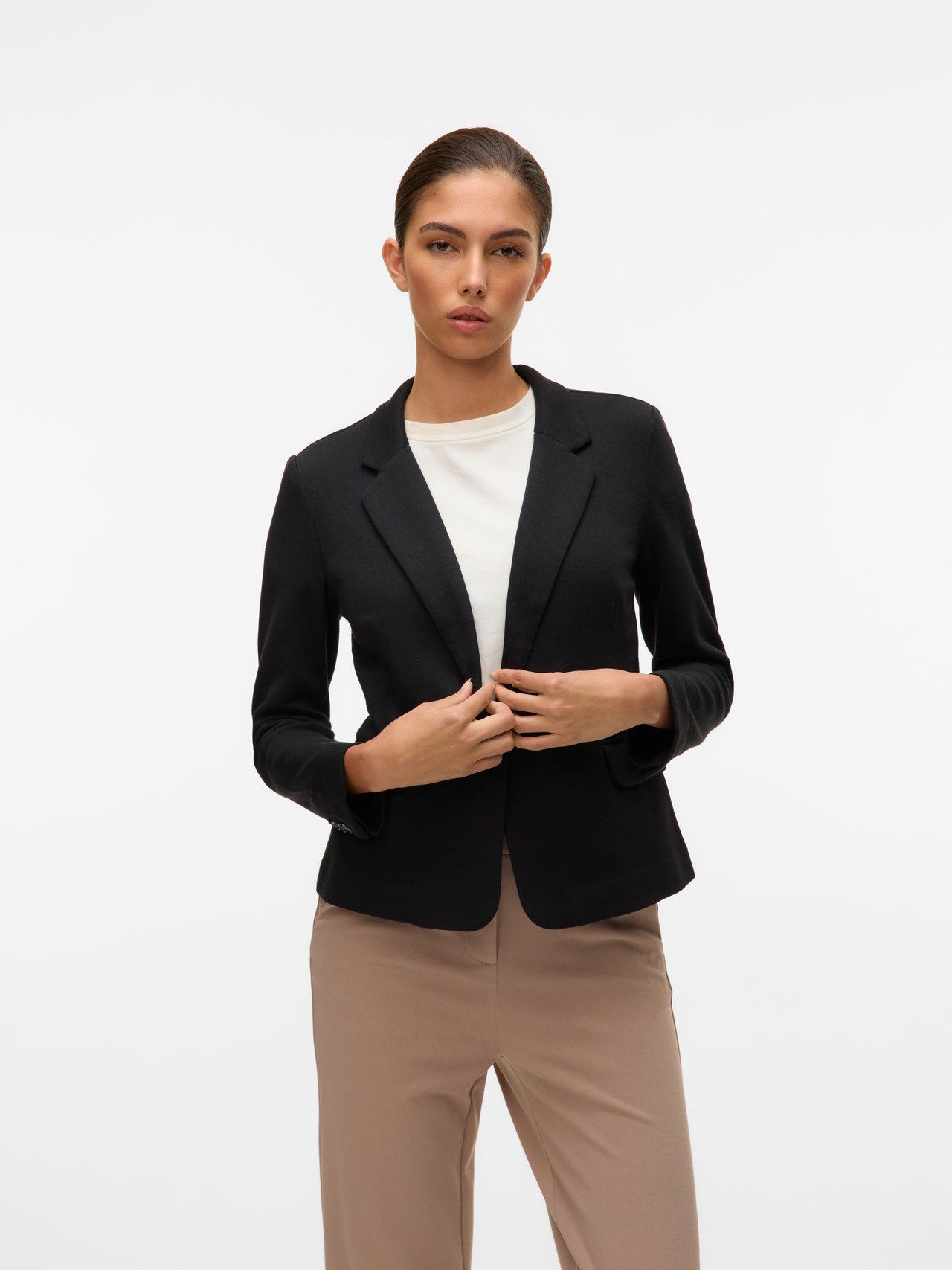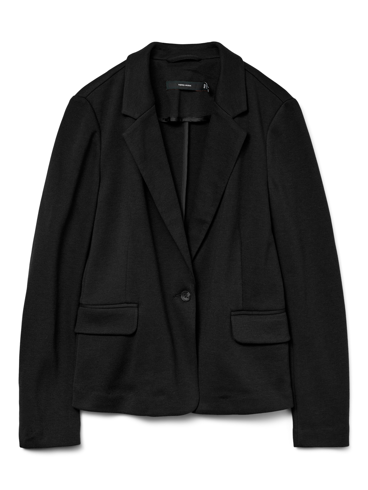 Melna sieviešu žakete ikdienas valkāšanai. Uzticams apģērba gabals, ko var kombinēt gan ar džinsiem, svārkiem, gan piegrieztām biksēm. Ērts, standarta piegriezums no viegli kopjama auduma, kas piemērots valkāšanai visu gadu.
