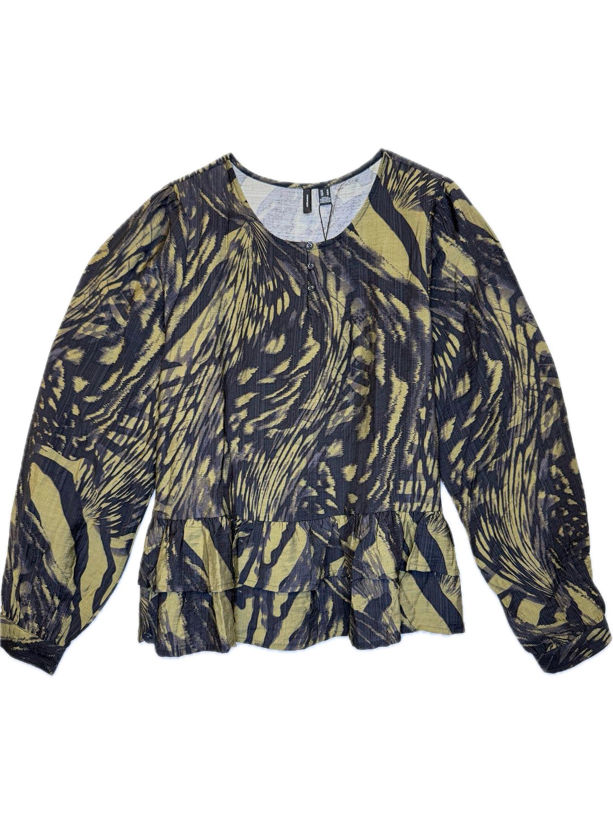 Long-sleeve blouse featuring a bold abstract animal-style print,button detail,and a ruffled peplum hem.