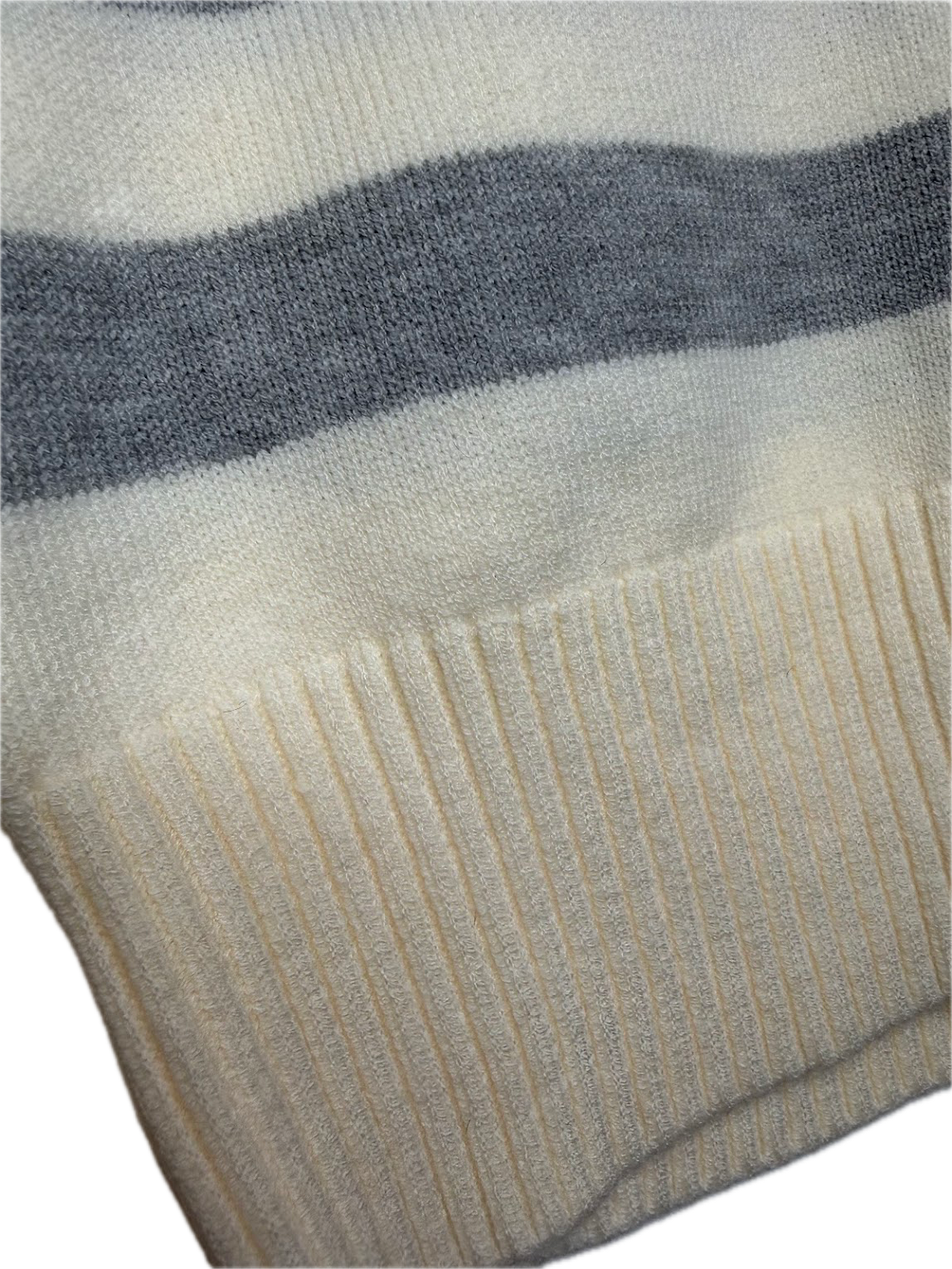 Soft cream knit sweater featuring bold grey horizontal stripes and a cozy mock neckline.