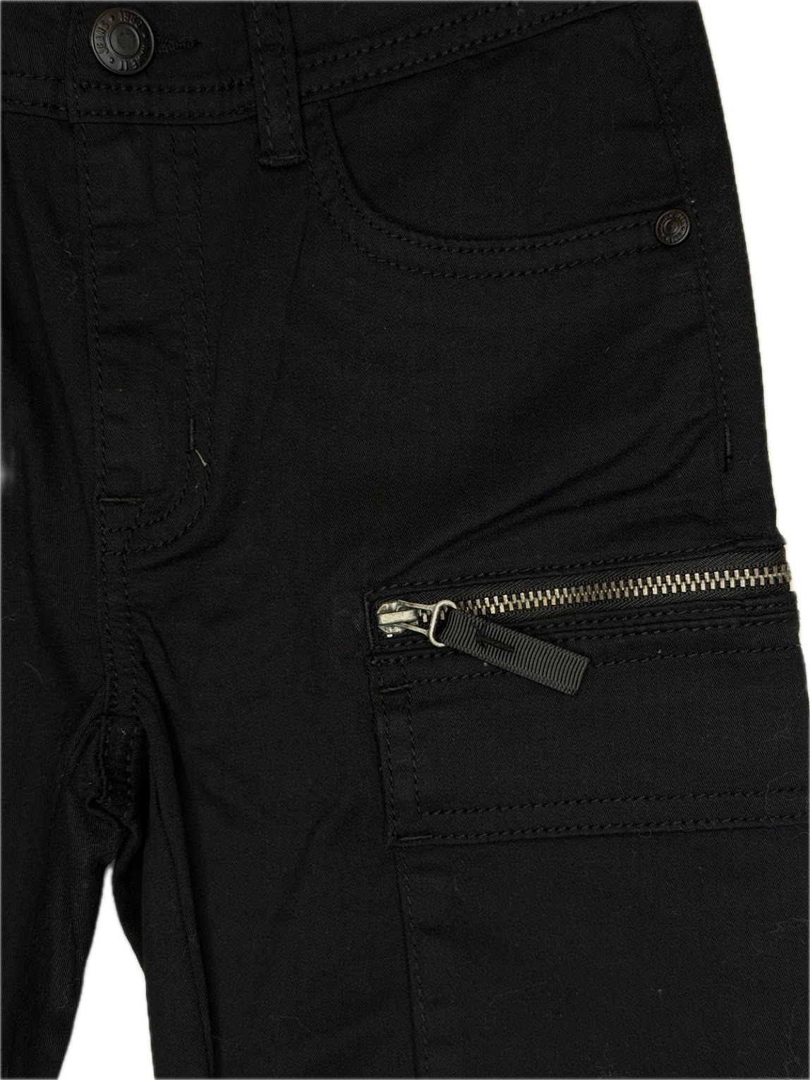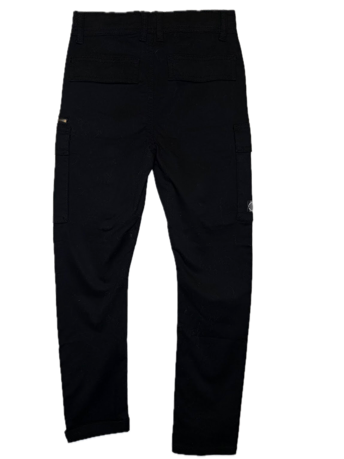 Practical black cargo pants featuring a slim fit and functional side pockets with zipper details.