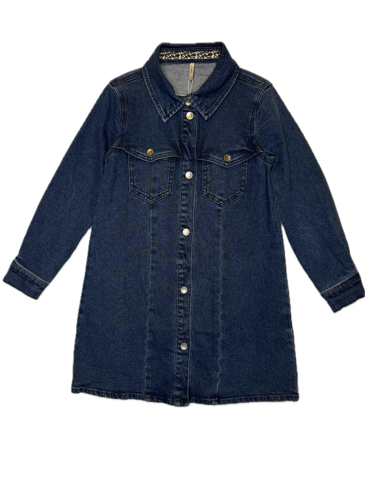 Classic blue denim dress featuring distressed detailing and a raw hem