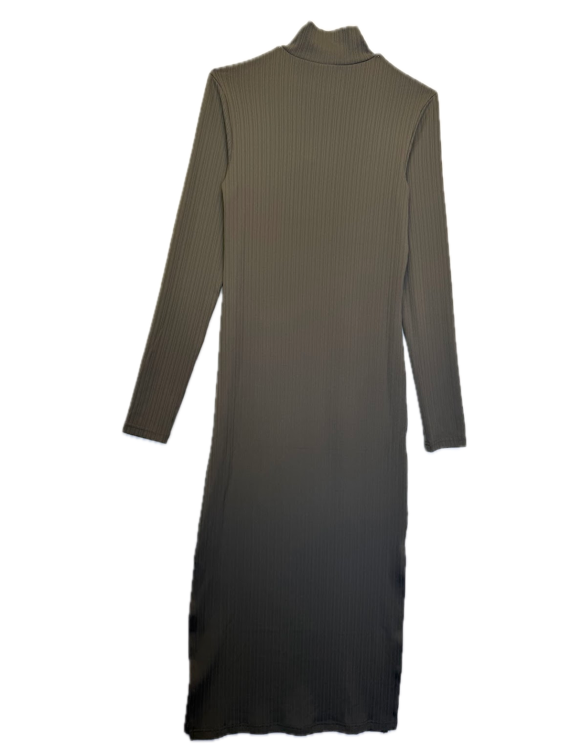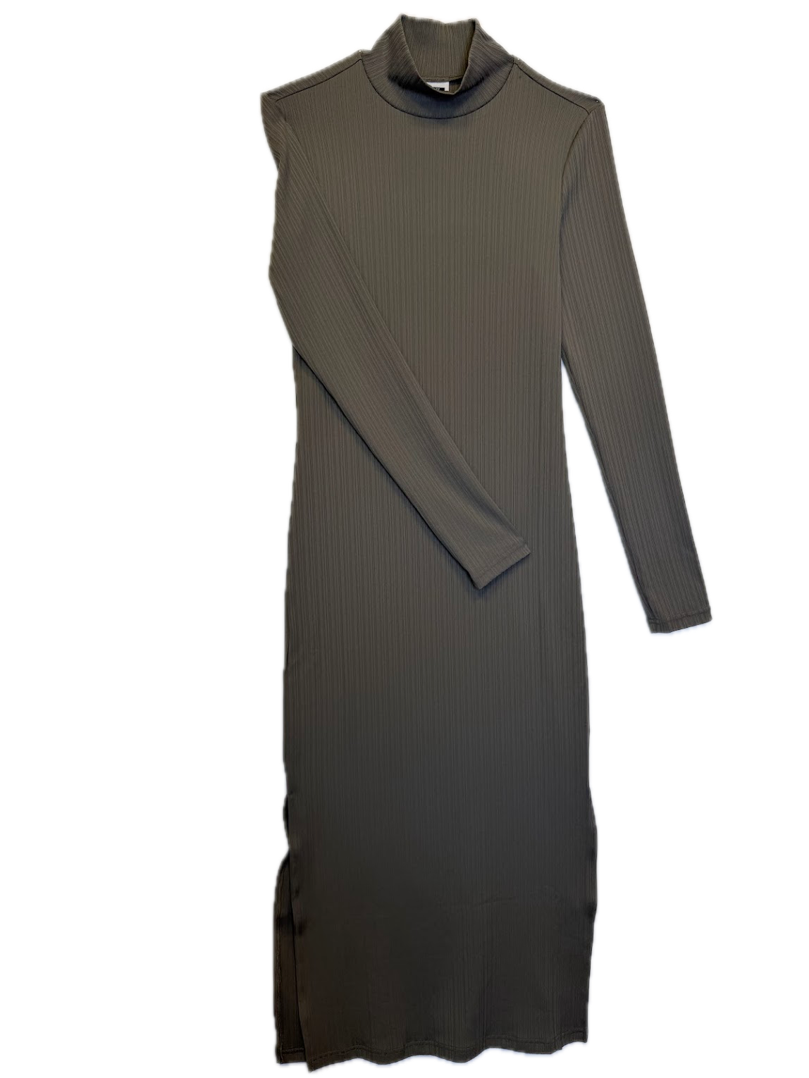 Fitted grey midi dress crafted from ribbed fabric featuring a mock neckline