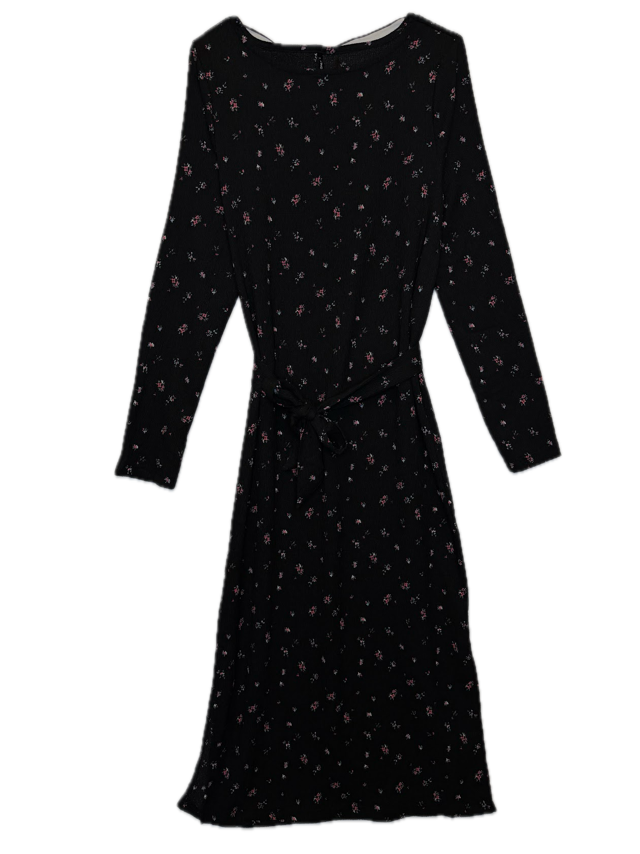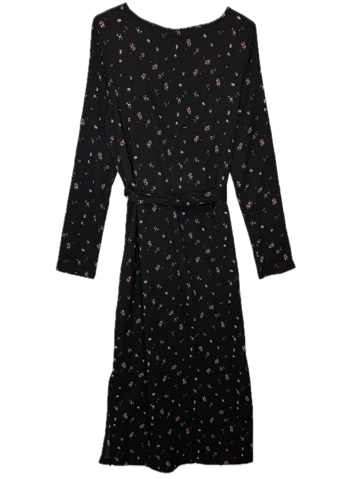 Textured black midi dress with a delicate multi-color floral print and a self-tie waist belt.