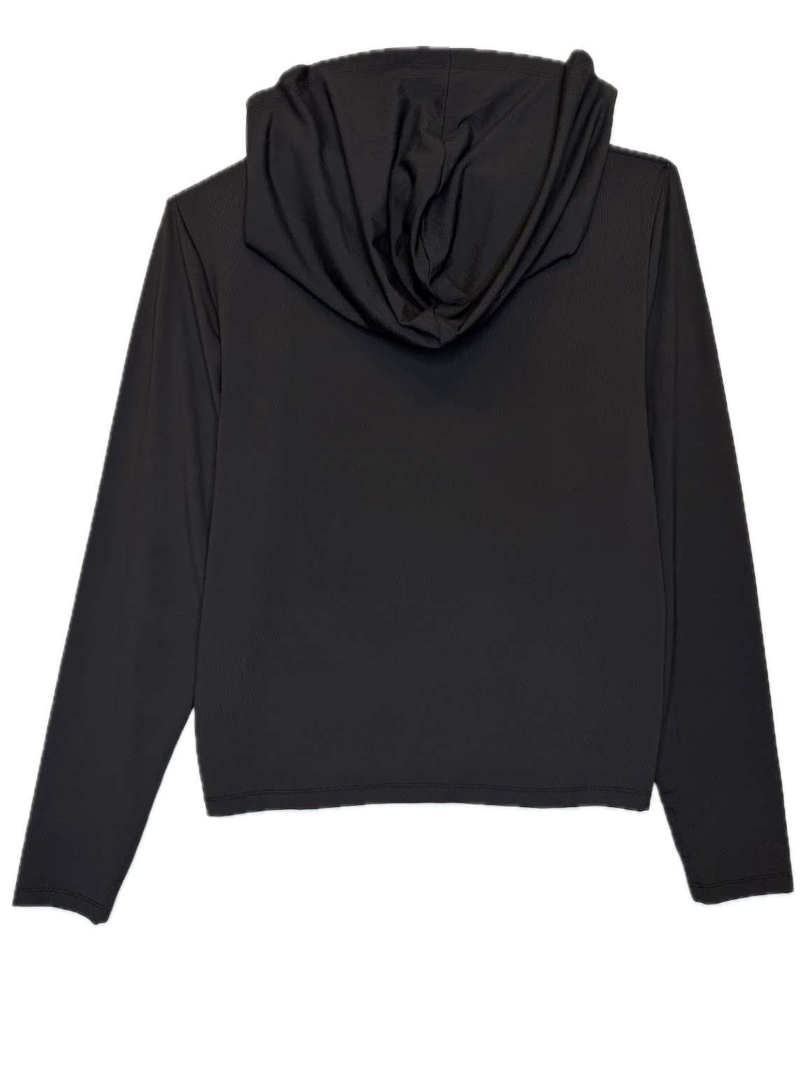 Simple and sleek black long-sleeve top featuring a lightweight hood and a regular