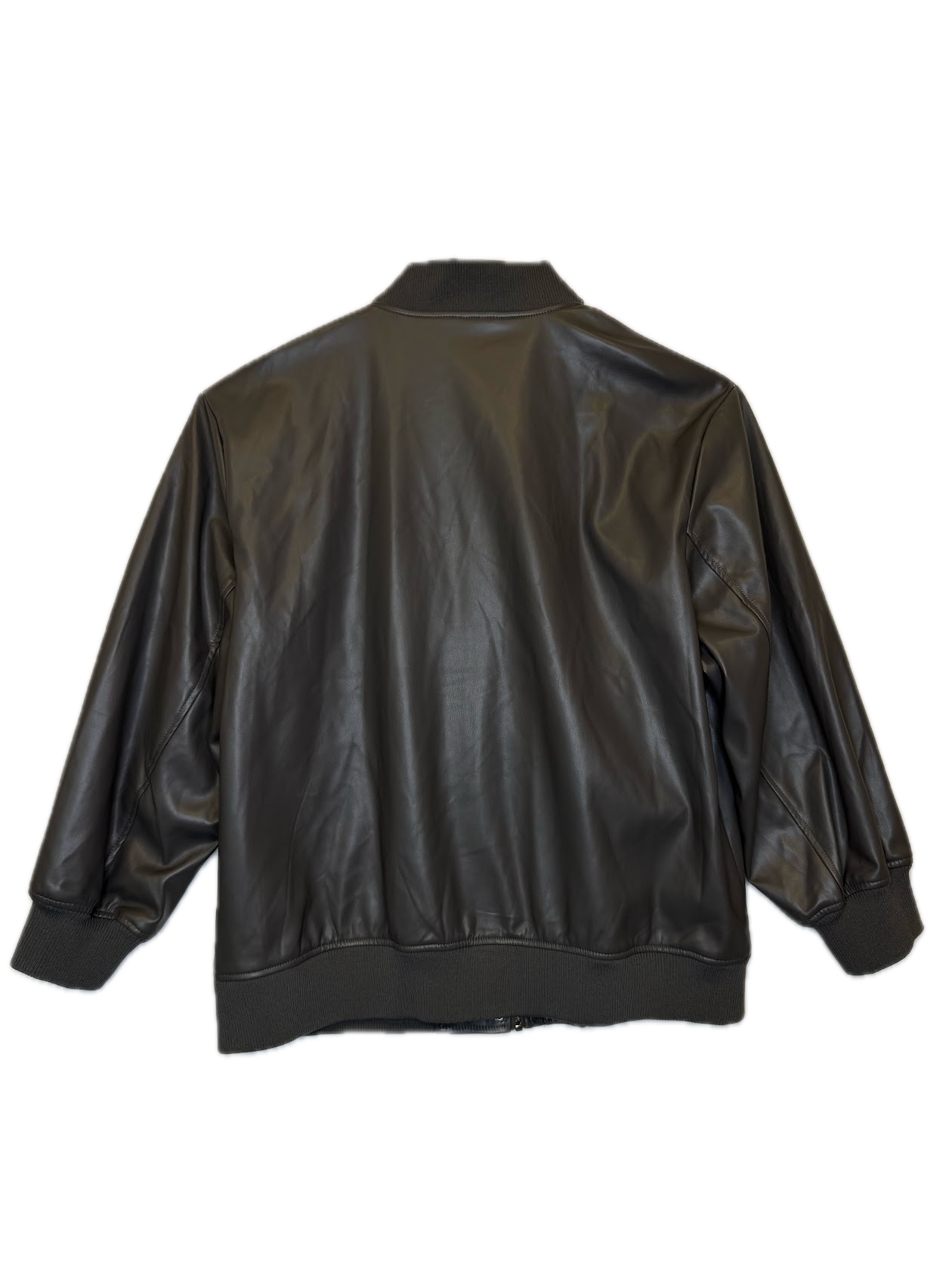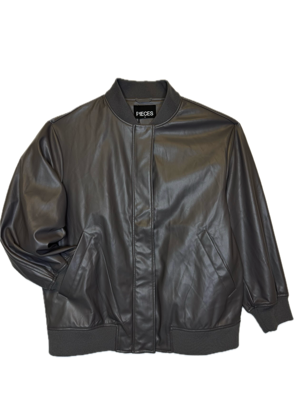 Sleek grey faux leather bomber jacket featuring a zip-front closure and ribbed knit collar