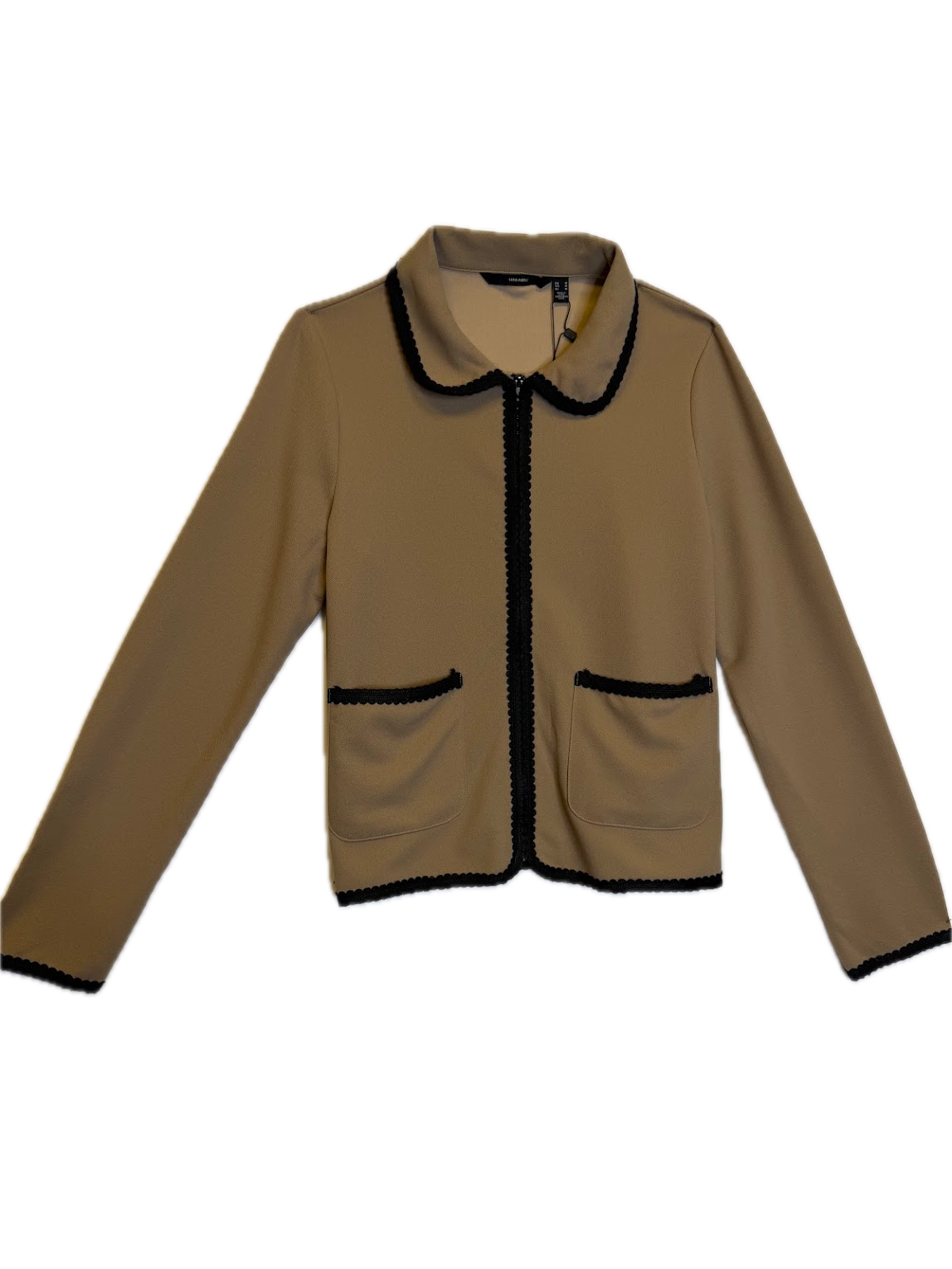 Khaki knit jacket with black contrast trim along the collar, front, and pocket edges. Cut in a straight, cardigan-style silhouette with long sleeves and a rounded collar. The soft, structured knit makes it a polished alternative to a blazer.