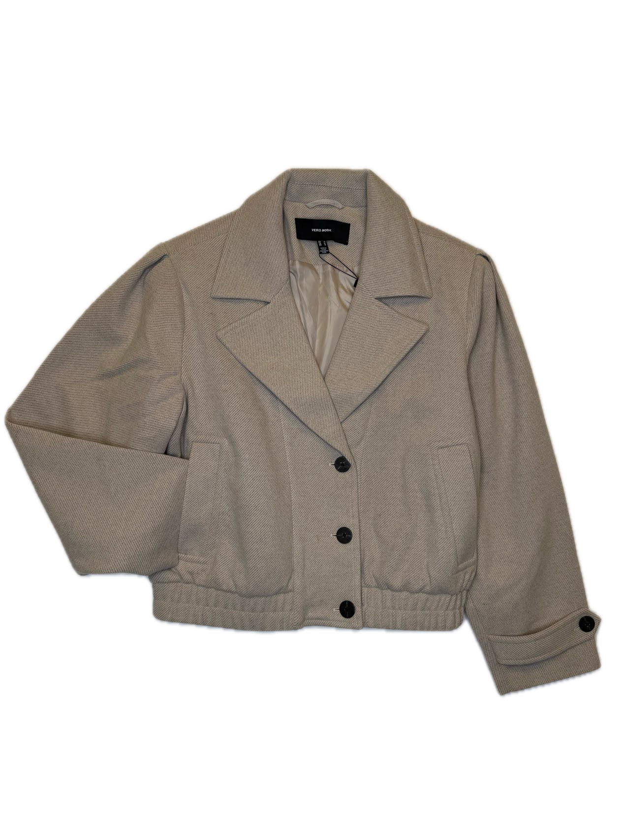 Light beige cropped jacket with a three-button front and pointed collar. Features subtle gathers and elastic at the hem for a blouson effect, plus button-tab cuffs. Smooth woven fabric gives it a neat, modern finish.