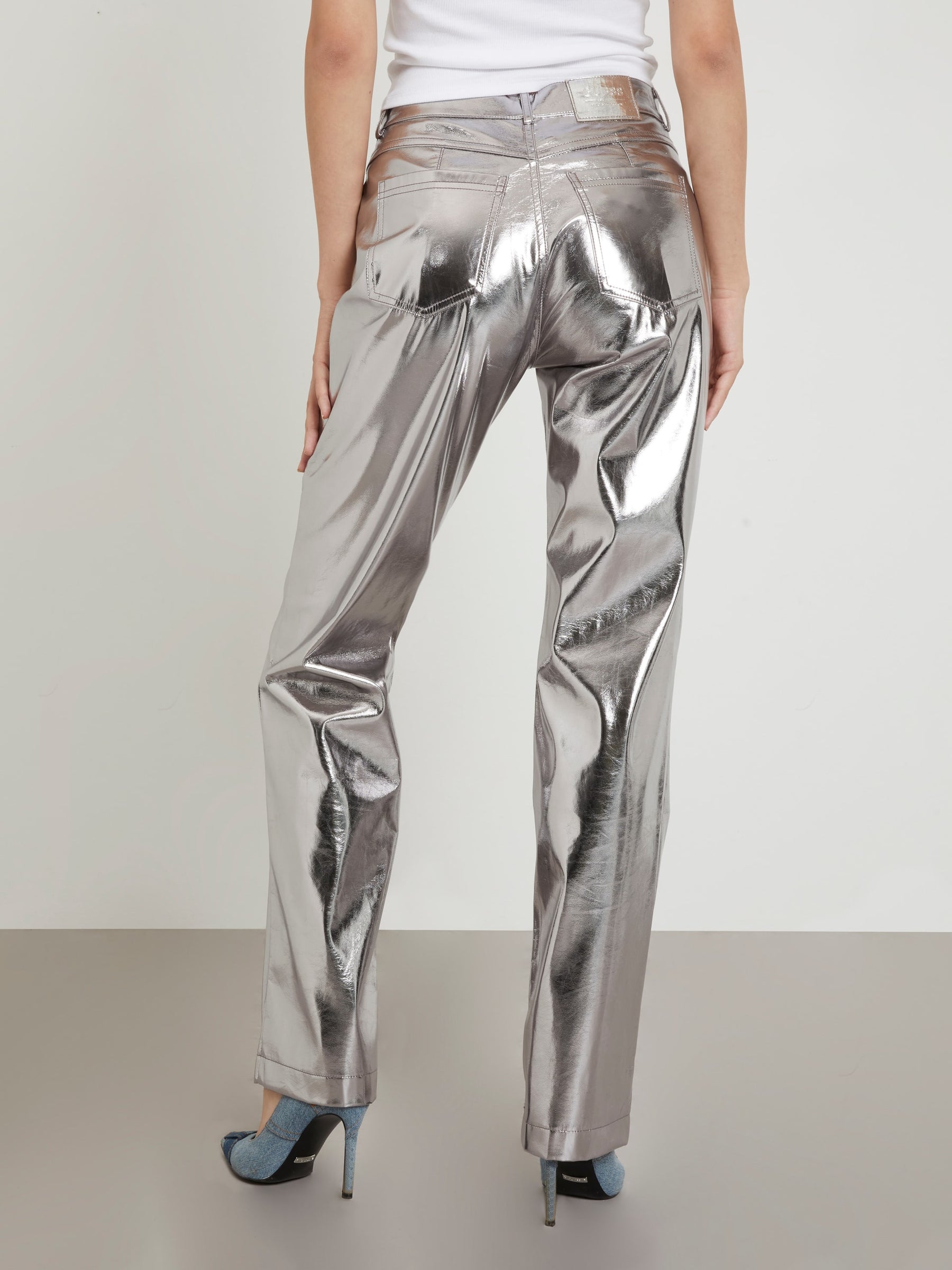 Cut for a regular fit, it pairs readily with tees, blouses and lightweight knits. The silver tone is simple to match and the polyurethane construction keeps care straightforward—follow the label and avoid over‑drying to preserve handfeel and color.