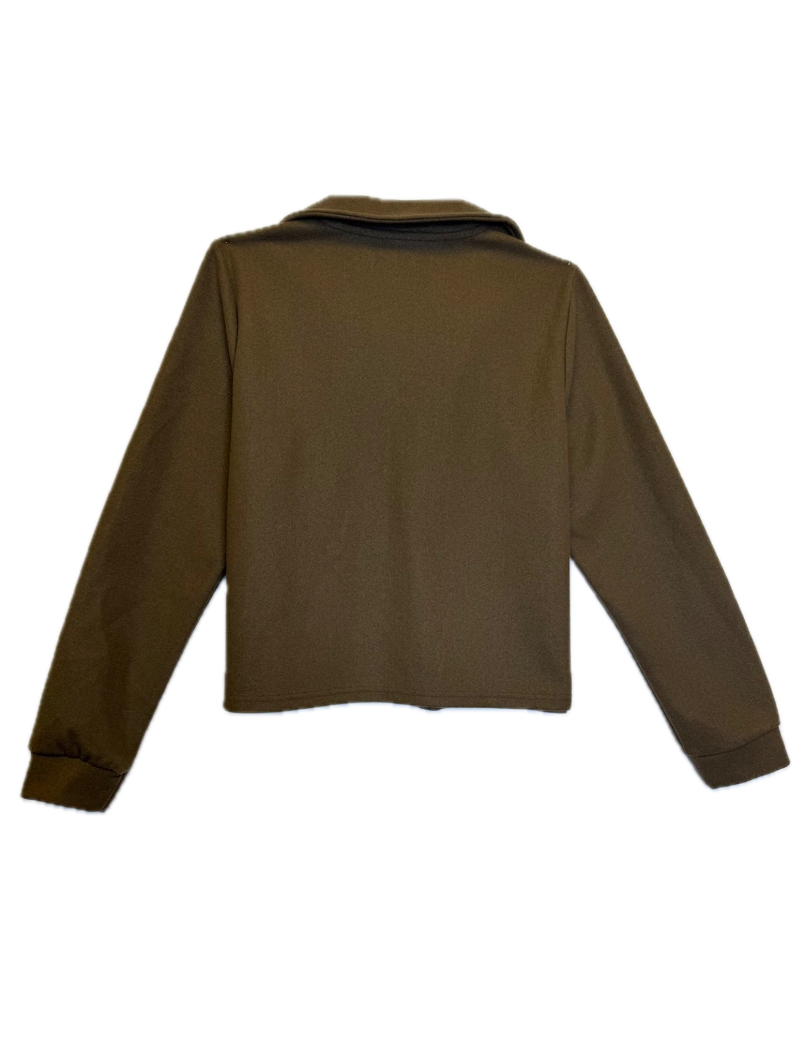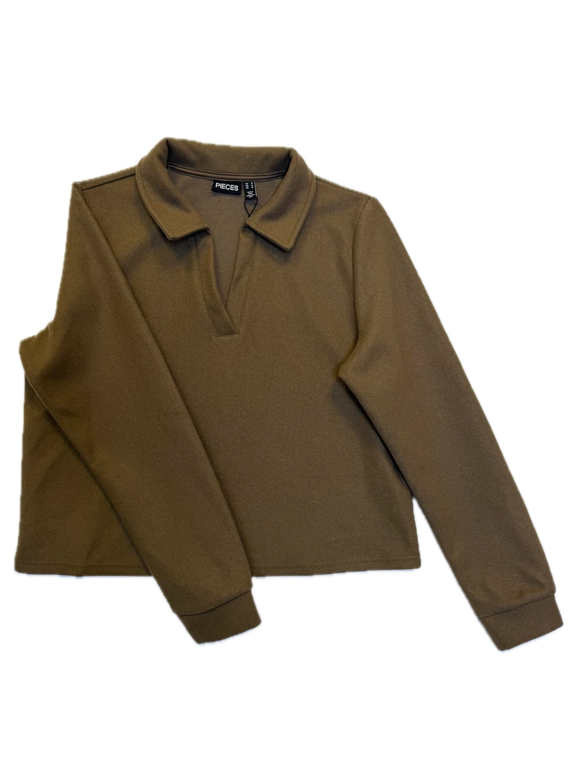Relaxed olive green pullover featuring a polo-style spread collar with an open V-neckline.
