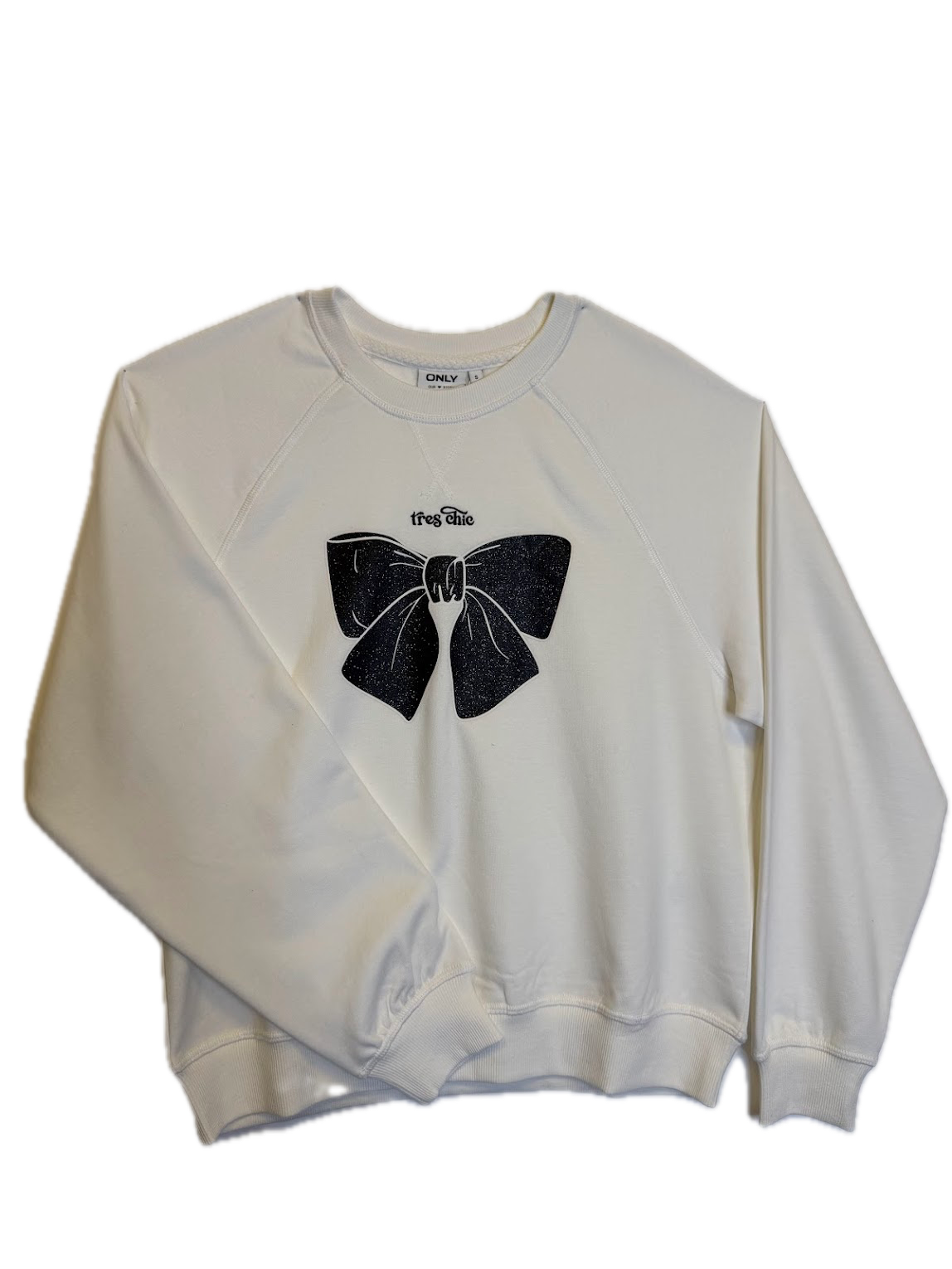 White crewneck sweatshirt featuring a large black glitter bow graphic with 'très chic' script text.