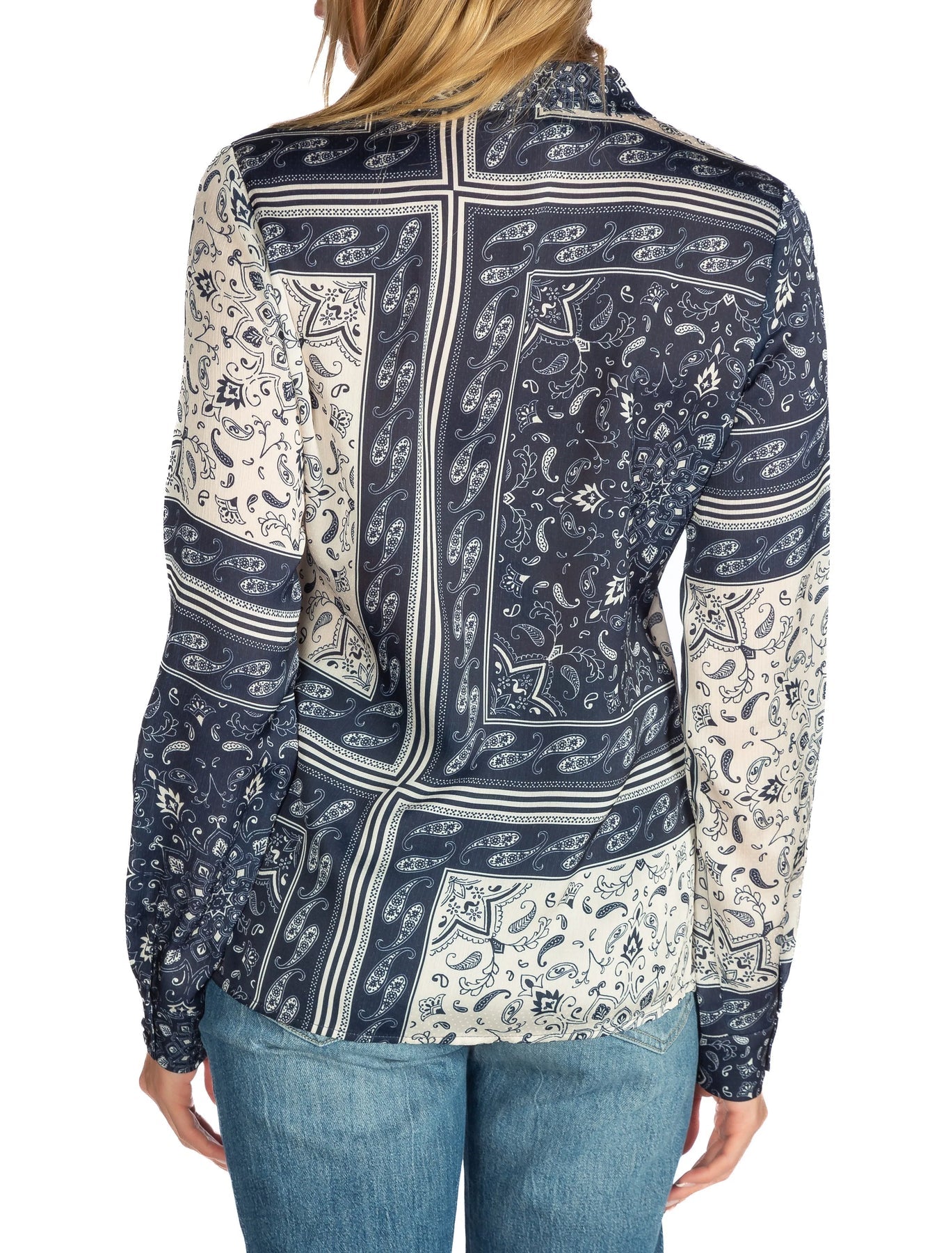 A fluid blouse with a distinctive sashiko-inspired print. The airy weave drapes beautifully, while a relaxed cut and button front make it an easy styling piece for desk-to-dinner days. Wear tucked into denim or loose over slim trousers.