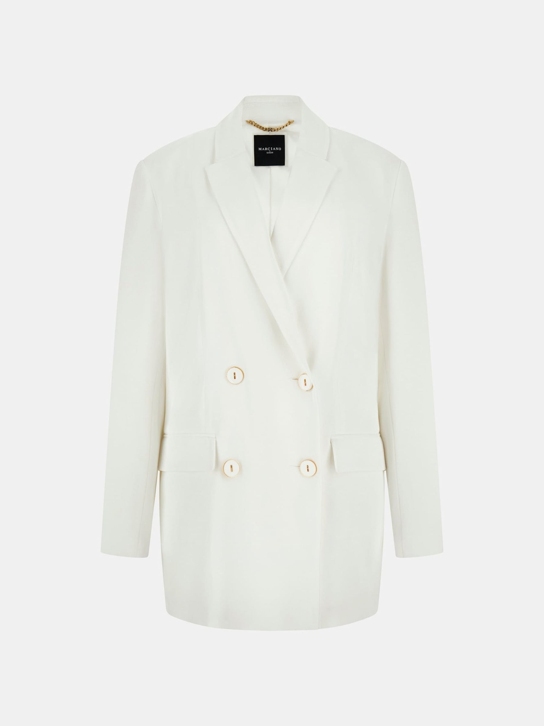 In bright white, it freshens monochrome looks and pairs seamlessly with denim or suiting separates. Dry clean recommended to maintain shape and finish.