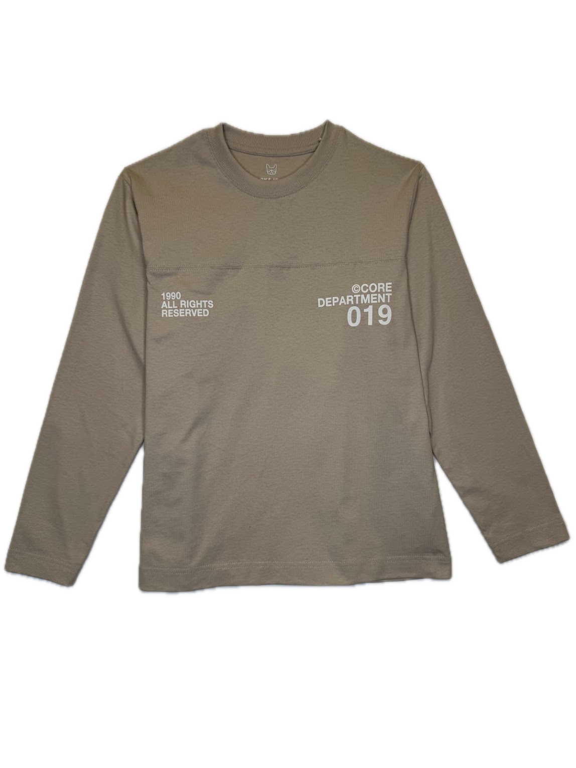 Casual beige long-sleeve t-shirt featuring minimalist 'Core Department 019' text on the chest.